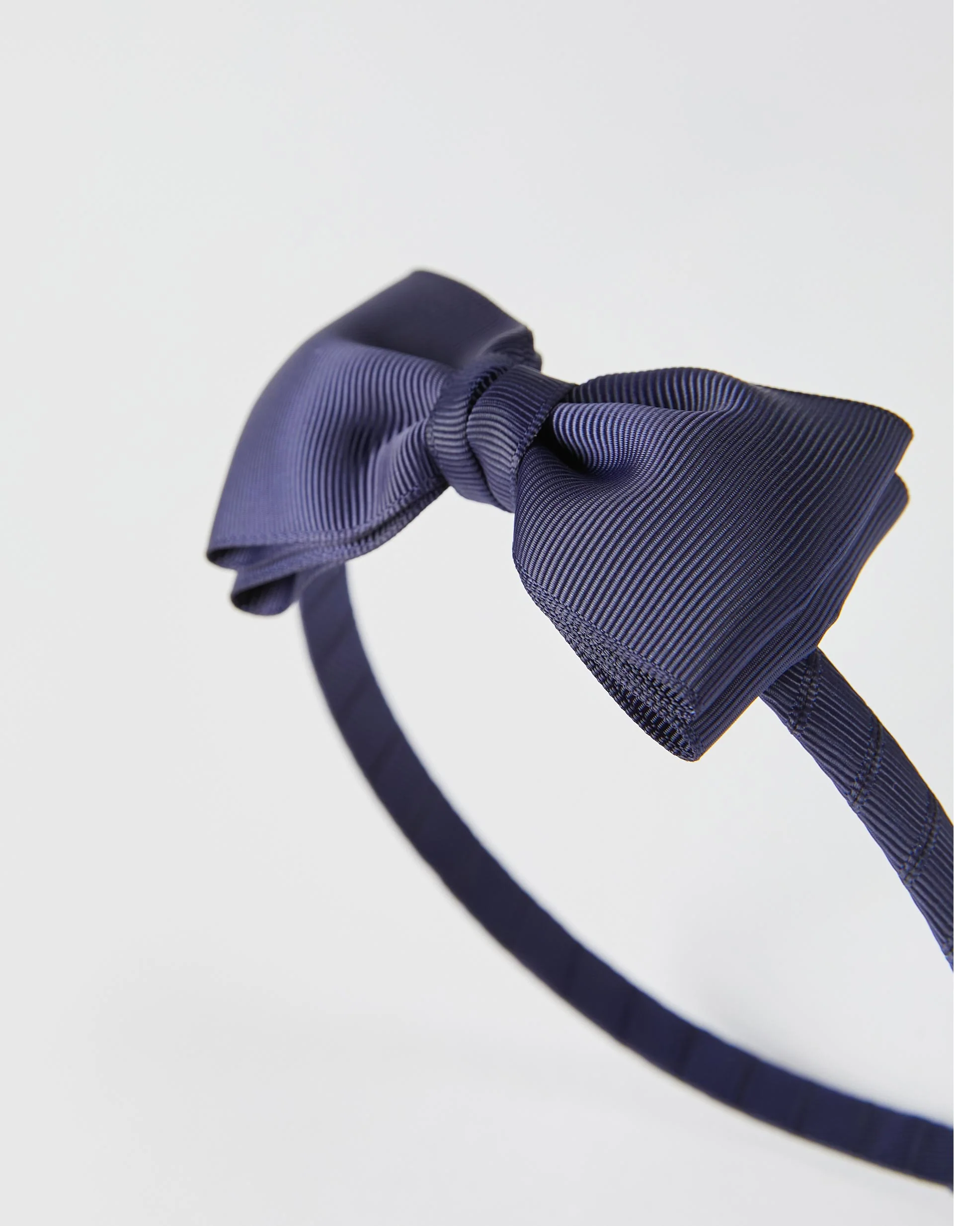 Dark blue Alice band for girls, covered in fabric and with bow on the side.