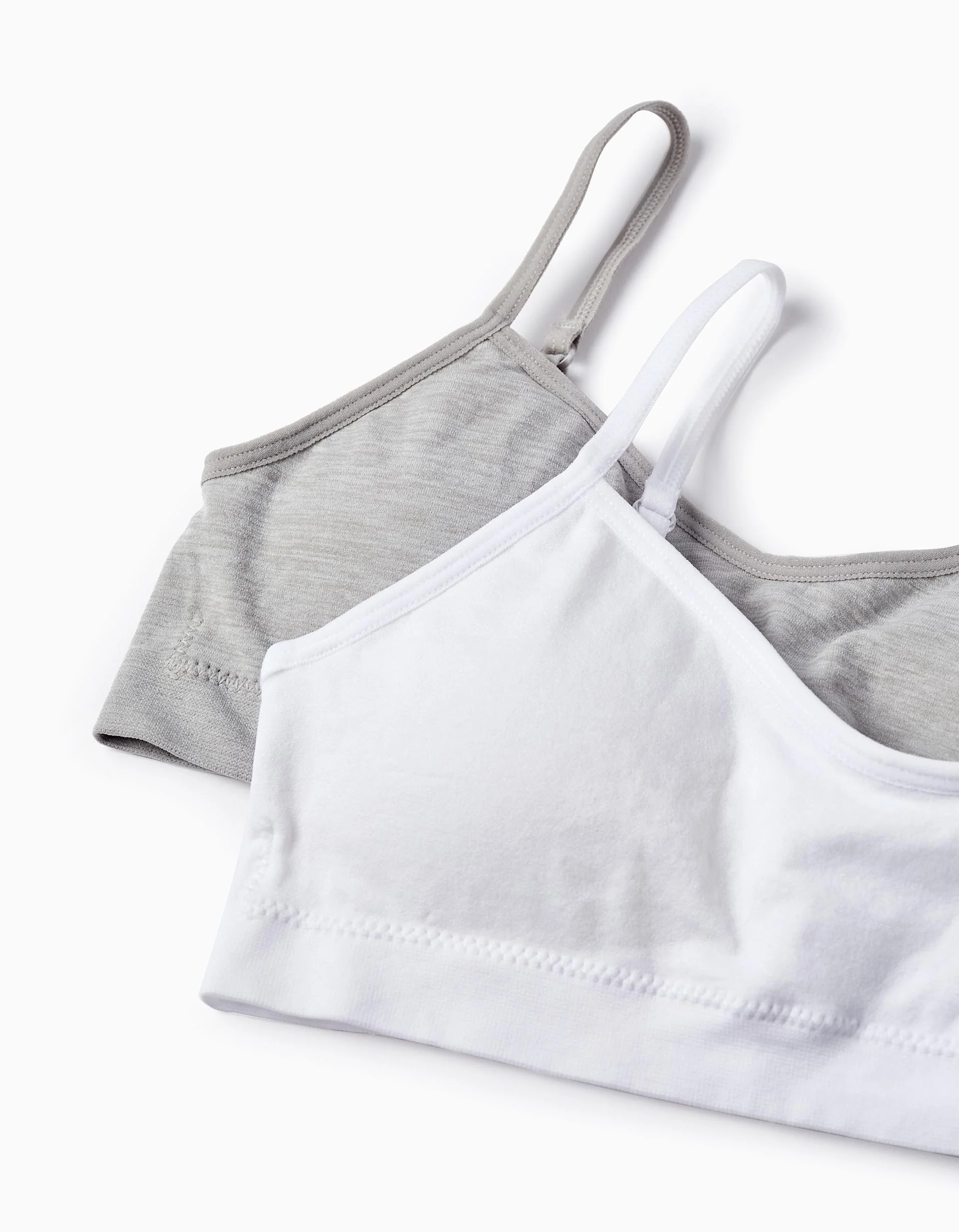 Pack of two wire-free bras for girls, one white and one grey, in microfiber fabric with stretch for maximum comfort. With removable padding. Adjustable elastic straps. Printed inner labels to not irritate the skin. We Care: article with Oeko-Tex Standard 100 certificate, which guarantees the absence of harmful or irritating substances for the skin. Underwear that accommodates girls' body changes, ensuring comfort and well-being.