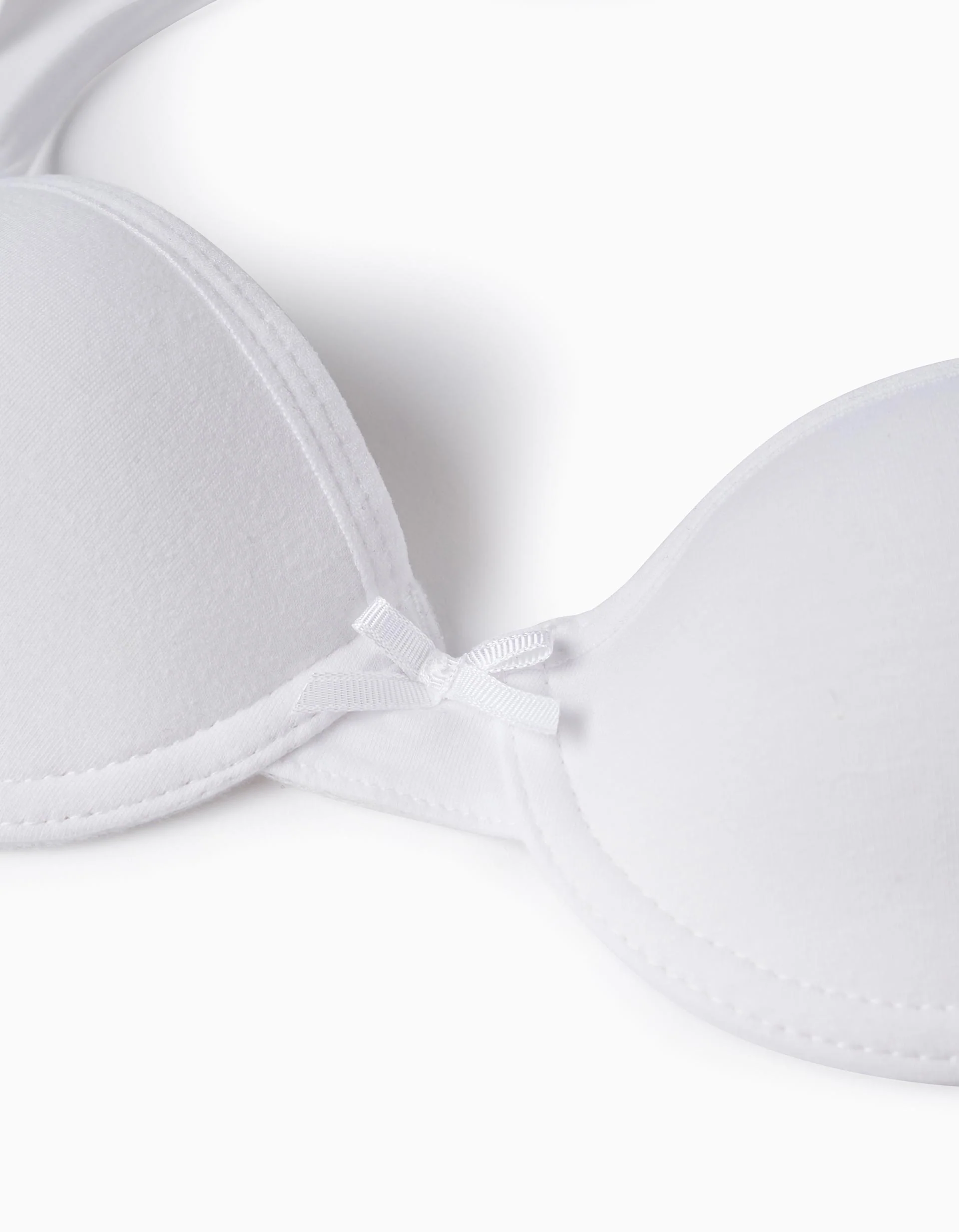 Pack of two white bras with underwire for girls. Slightly padded cups and adjustable elastic straps. Small bow at the front. Fastens at the back with an adjustable hook and loop fastener. We Care: article with Oeko-Tex Standard 100 certification, which guarantees the absence of harmful or irritating substances for the skin. Underwear that accommodates girls' body changes, ensuring comfort.