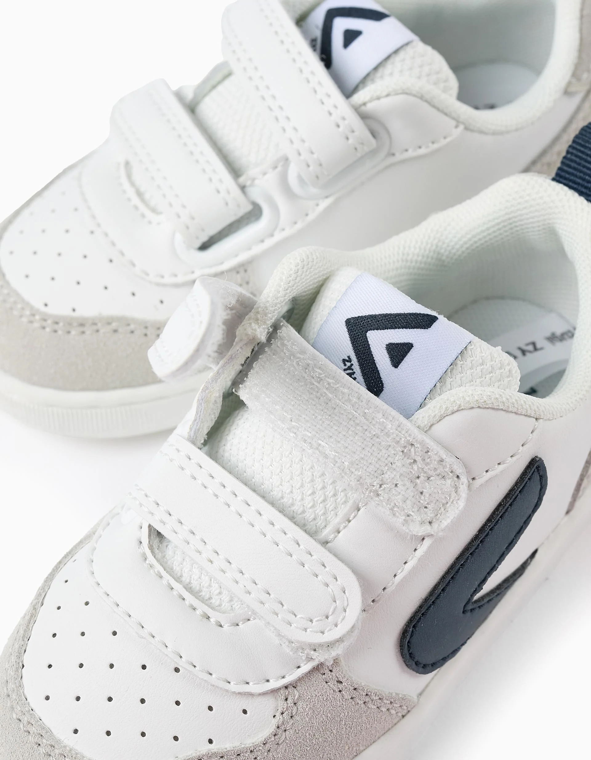 White trainers for babies, made of synthetic leather with contrasting dark blue details. Mesh lining and perforated upper to ensure maximum breathability. Fastens with touch-fastener straps for easy dressing. Non-slip sole. A pair of classic and timeless trainers, suitable for any style, from the most traditional to the most modern. Big Me: Half-circles on the insoles so children can identify the left and the right foot, encouraging them to be autonomous.