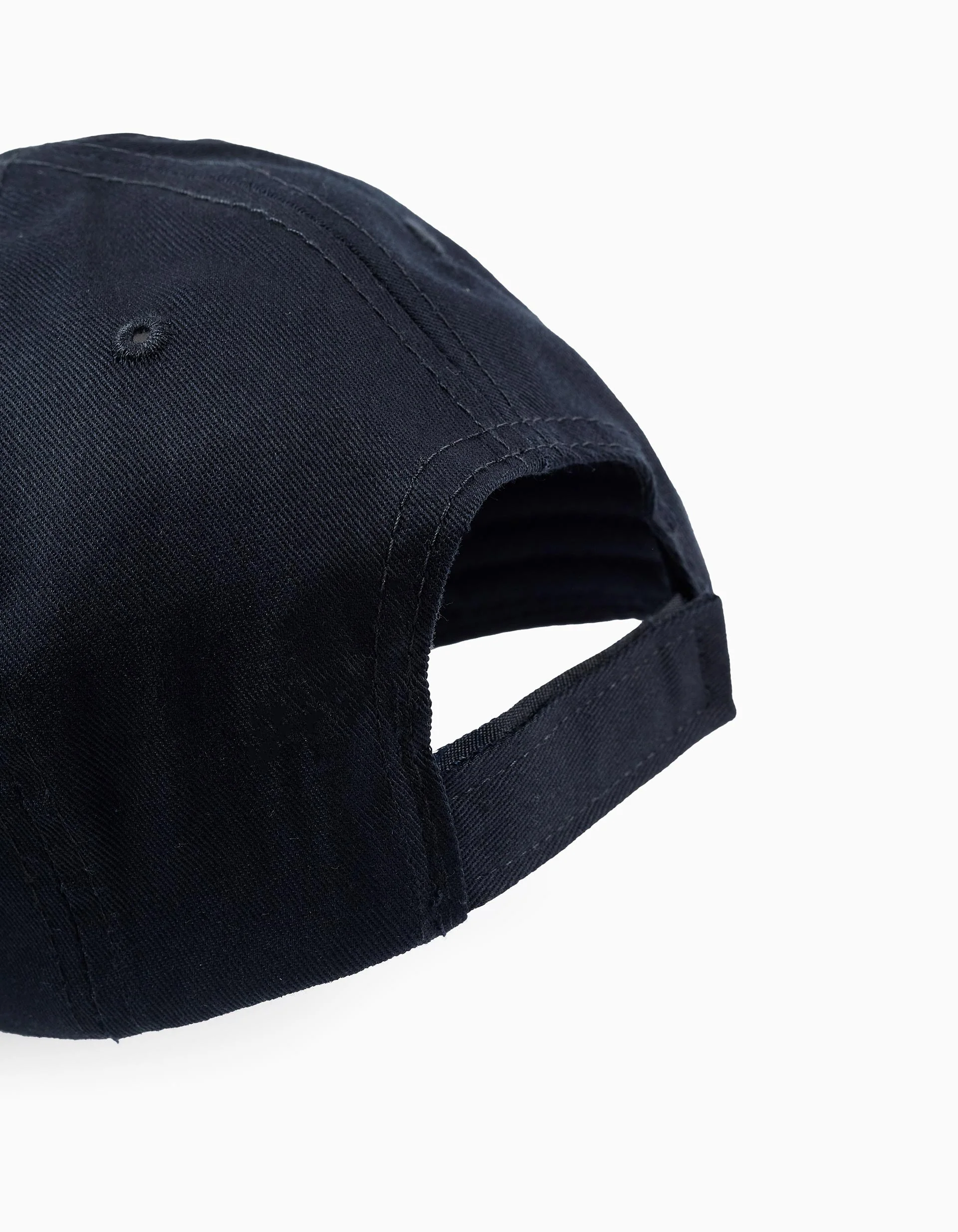 Dark blue twill cap for boys, 100% cotton. Branding detail embroidered in white on the front for contrast. Adjustable at the back with a touch fastener strap.