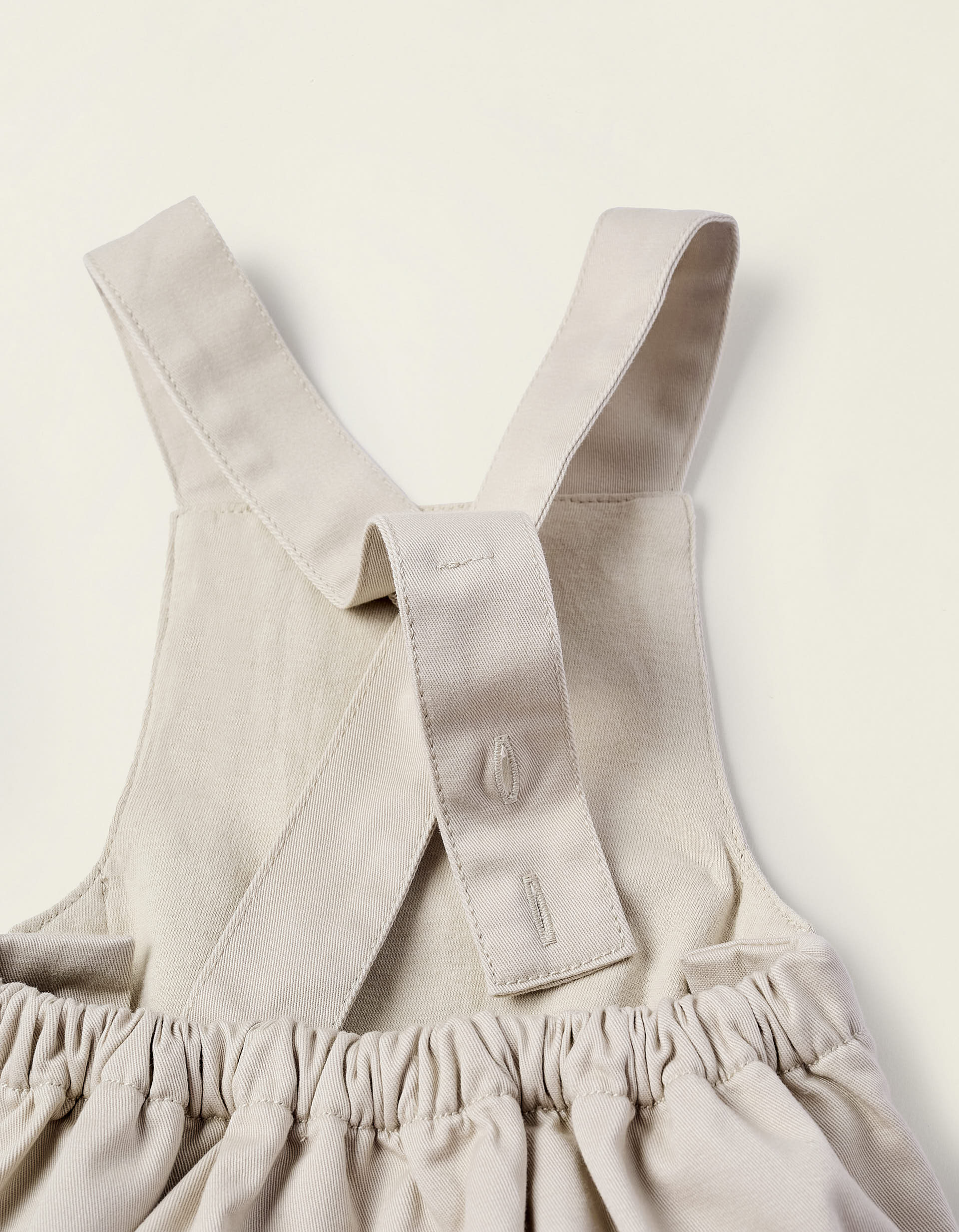 Beige twill jumpsuit for newborns. Adjustable straps that cross at the back. Pocket on the chest. Elastic waist at the back, with side buttons. Elastic cuffs for a perfect fit. Snap fasteners at the crotch for easy dressing. A classic in the baby's wardrobe.
