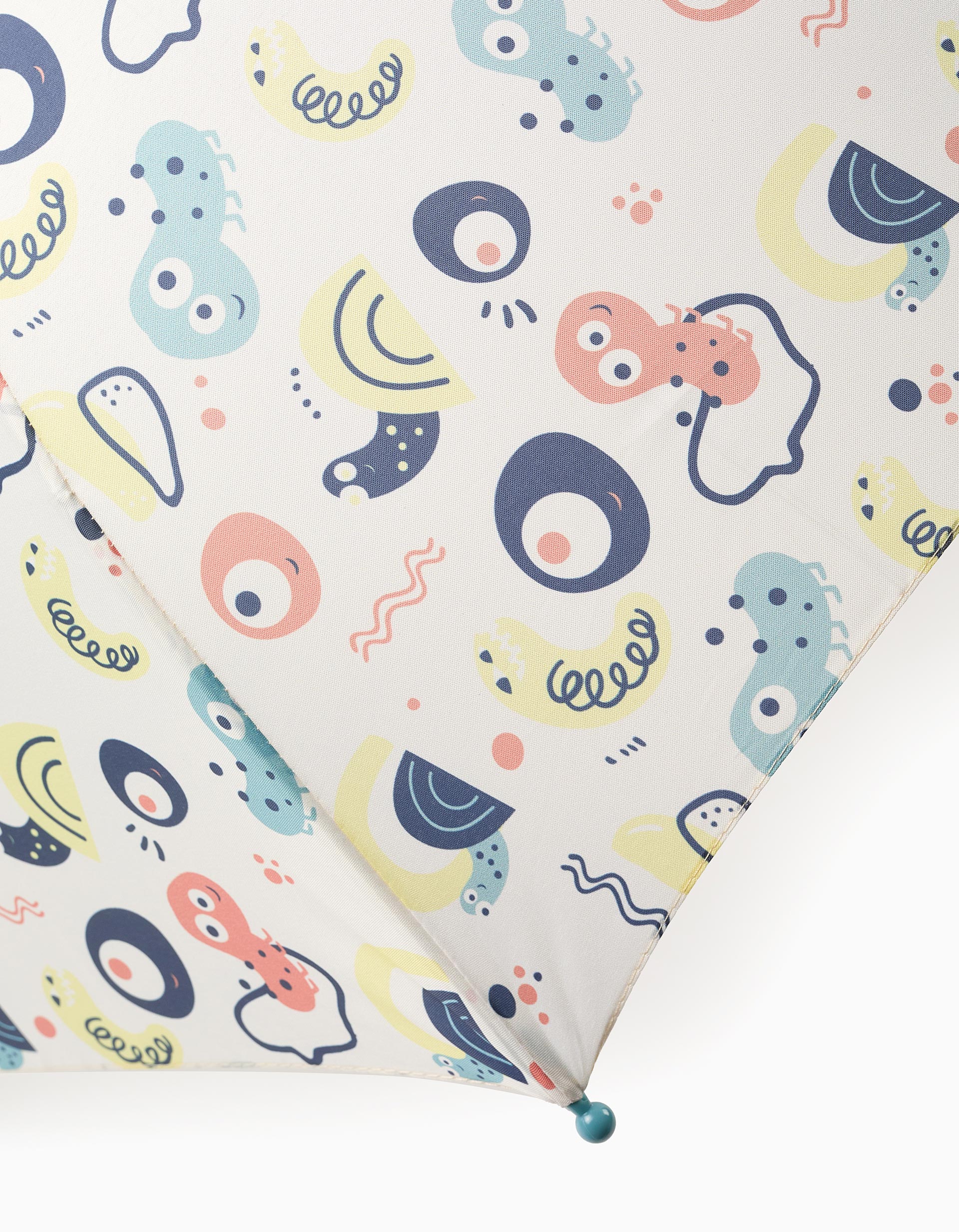 Beige umbrella for baby and boys, with a varied pattern of colourful little animals. Fastens with a touch fastener strap. Automatic opening with a protection system and plastic handle. Tip and base of the ribs with pink plastic balls for added safety. A practical and fun accessory for rainy days.